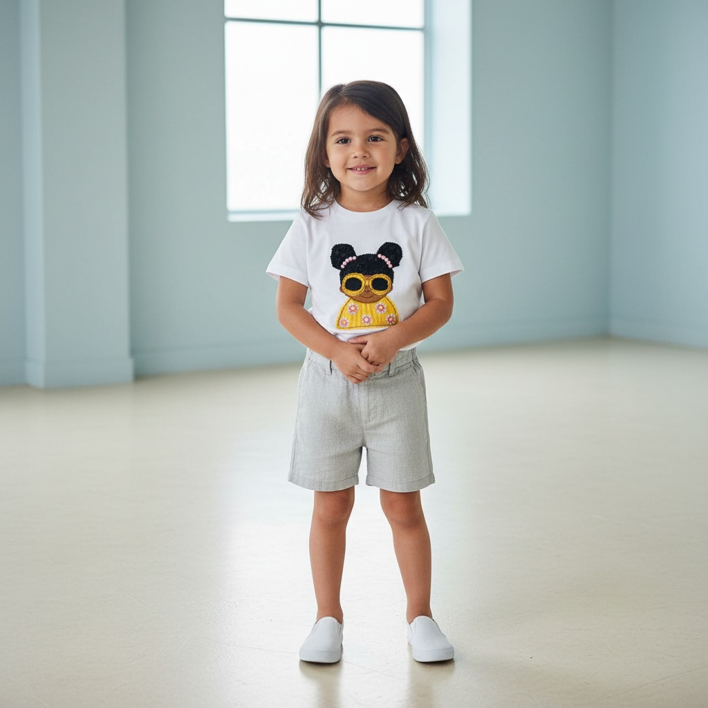 تیشرت سفید کودکانه با استیکرهای دست دوز پارچه ای طرح گیزل