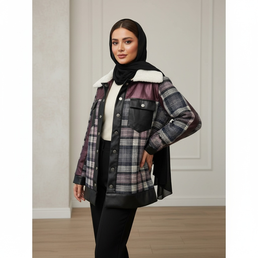 کت پشمی آستردار زنانه ترکیبی با چرم و تدی طرح چهارخونه